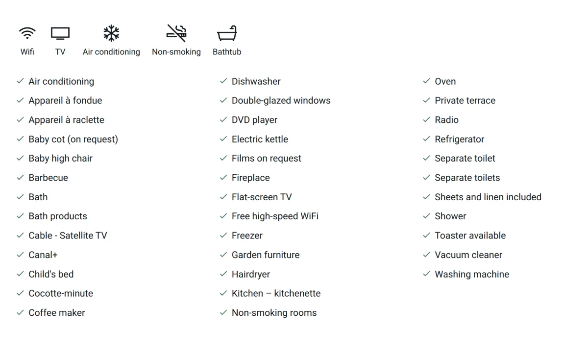 She makes life easier for her guests by offering a shelter for cars and bicycles, an office equipped with a library featuring fiber-optic and high-speed Wi-Fi connection. Her vacation home accepts pets, making family stays even more convivial.